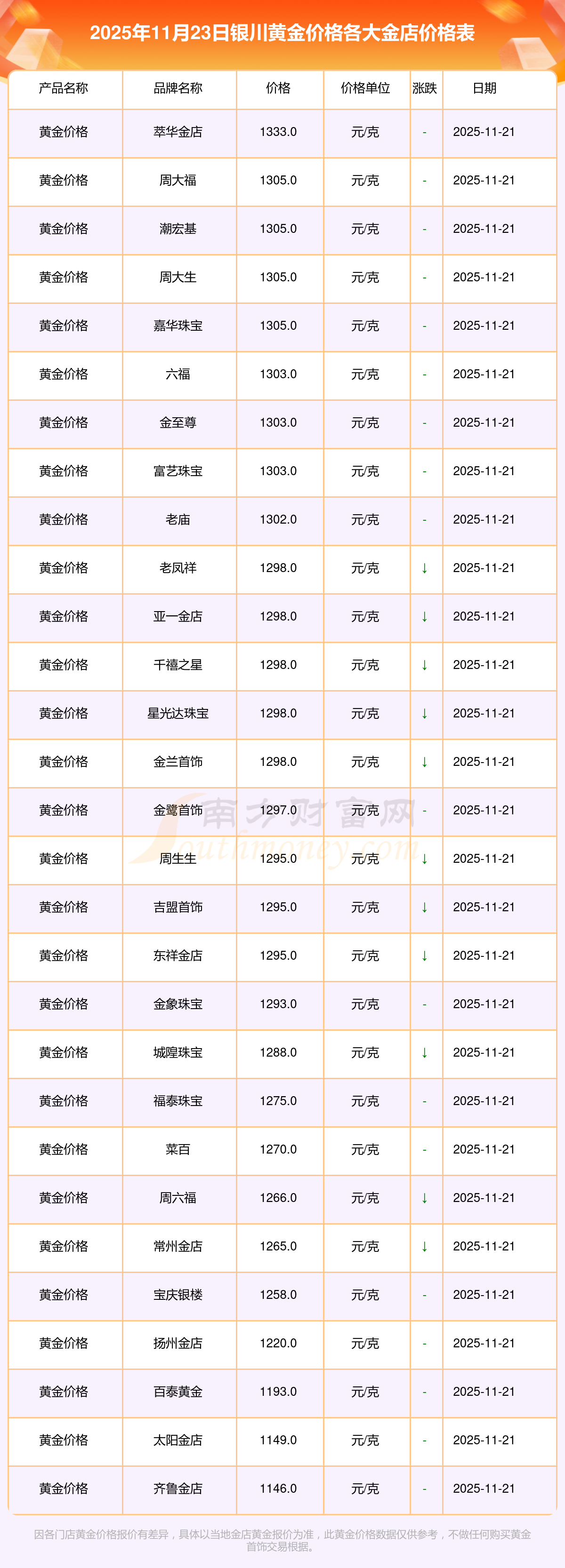 今天是2025年11月23日,银川周大福、周大福、周大福、周大福、周大福、周大福、周大福、老凤祥、老凤祥、老凤祥、周六福等各大金店品牌黄金价格最新价格如下:周大福1305.0元/克、周大福616.0元/克、周大福1305.0元/克、周大福45110.0、周大福17570.0、周大福40690.0、周大福1143.0元/克、老凤祥1298.0元/克、老凤祥600.0元/克、老凤祥1298.0元/克、周六福1266.0元/克。