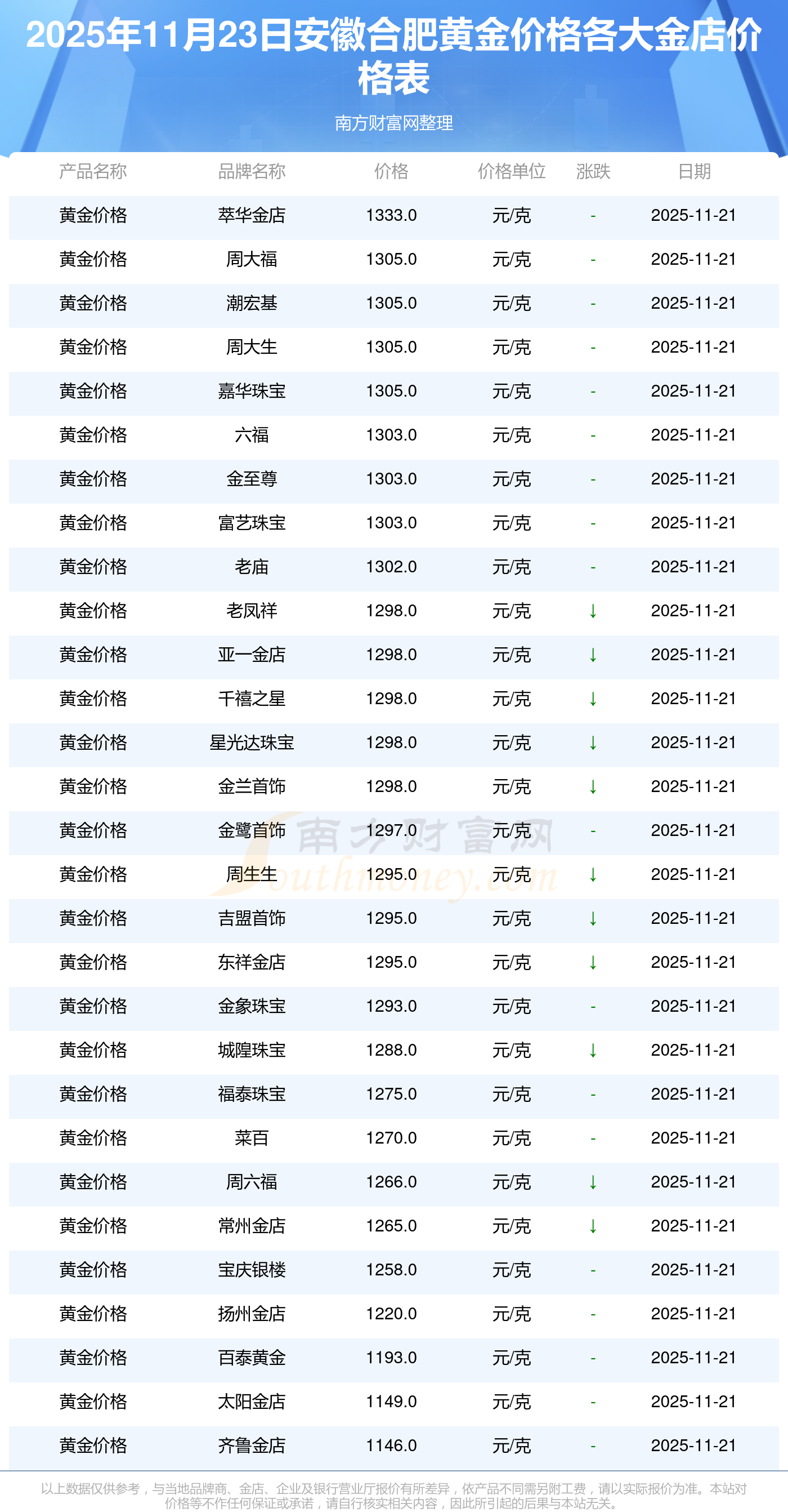2025年11月23日安徽合肥周大福、周大福、周大福、周大福、周大福、周大福、周大福、老凤祥、老凤祥、老凤祥、周六福等各大金店品牌黄金价格最新价格行情来了,如下:周大福黄金价格1305.0元/克,周大福铂金价格616.0元/克,周大福饰品金价(内地)1305.0元/克,周大福黄金饰品(香港)45110.0,周大福铂金价格(香港)17570.0,周大福金条价格(香港)40690.0,周大福金条金价(内地)1143.0元/克,老凤祥黄金价格1298.0元/克,老凤祥铂金价格600.0元/克,老凤祥足金价格1298.0元/克,周六福黄金价格1266.0元/克。