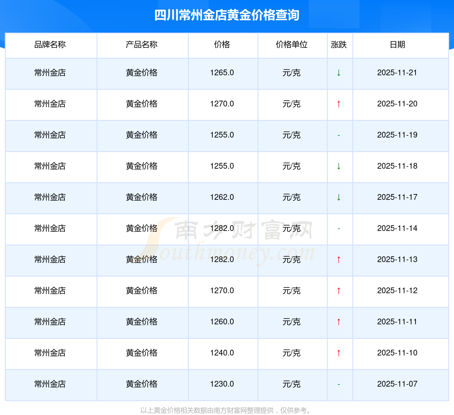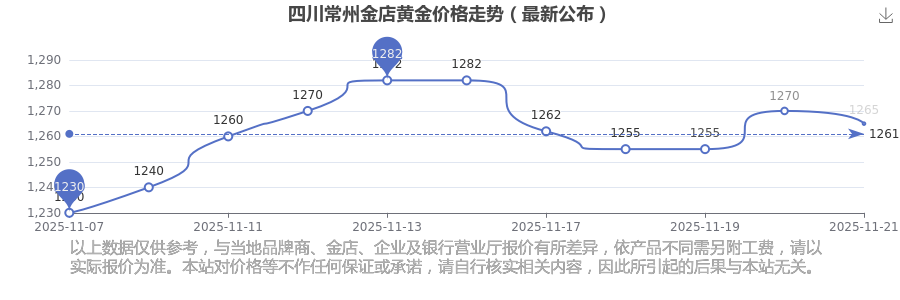 今日四川常州金店黄金价格最新为:1265.0元/克。