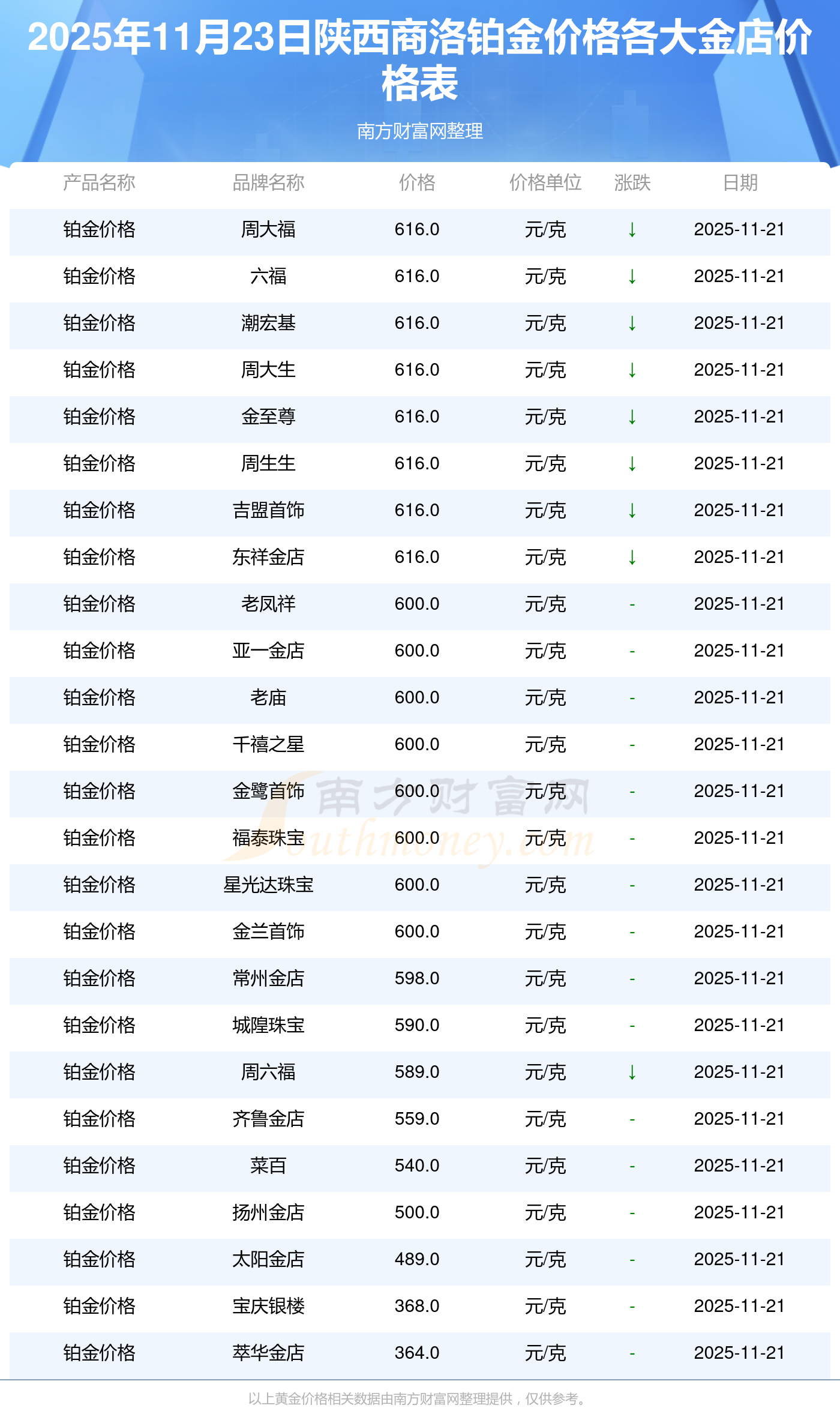 2025年11月23日陕西商洛各大金店铂金价格最新价格查询来了:周大福1305.0元/克,周大福616.0元/克,周大福1305.0元/克,周大福45110.0,周大福17570.0,周大福40690.0,周大福1143.0元/克,老凤祥1298.0元/克,老凤祥600.0元/克,老凤祥1298.0元/克,周六福1266.0元/克。