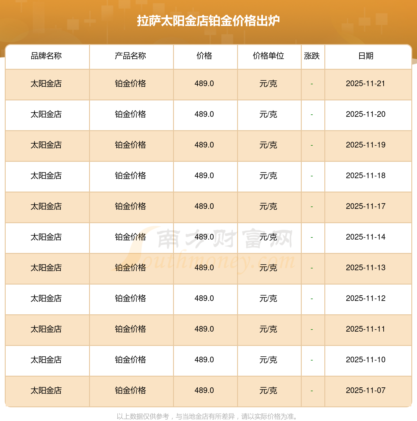 今日(2025年11月23日)拉萨太阳金店铂金价格最新价格为489.0元/克。