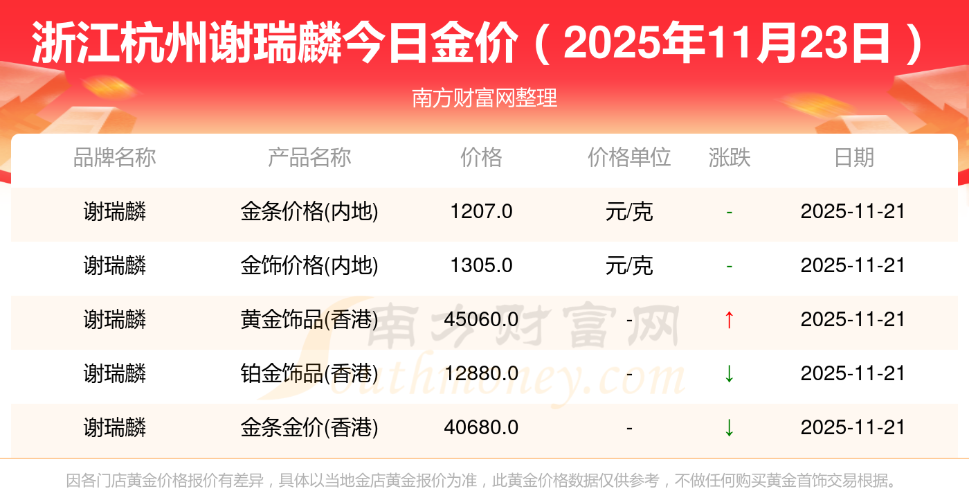 浙江杭州谢瑞麟金价今日价格:黄金价格1305.0元/克,铂金价格616.0元/克,饰品金价(内地)1305.0元/克,黄金饰品(香港)45110.0,铂金价格(香港)17570.0,金条价格(香港)40690.0,金条金价(内地)1143.0元/克,黄金价格1298.0元/克,铂金价格600.0元/克,足金价格1298.0元/克,黄金价格1266.0元/克。