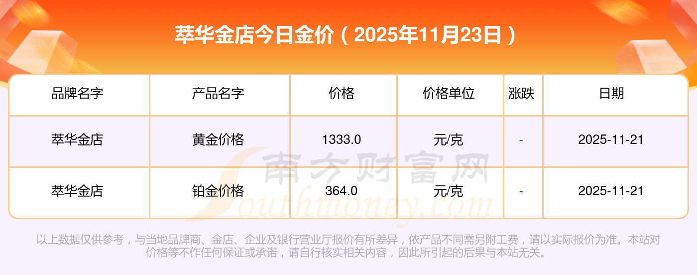 2025年11月23日萃华金店今日价格:黄金价格1305.0元/克,铂金价格616.0元/克,饰品金价(内地)1305.0元/克,黄金饰品(香港)45110.0,铂金价格(香港)17570.0,金条价格(香港)40690.0,金条金价(内地)1143.0元/克,黄金价格1298.0元/克,铂金价格600.0元/克,足金价格1298.0元/克,黄金价格1266.0元/克。