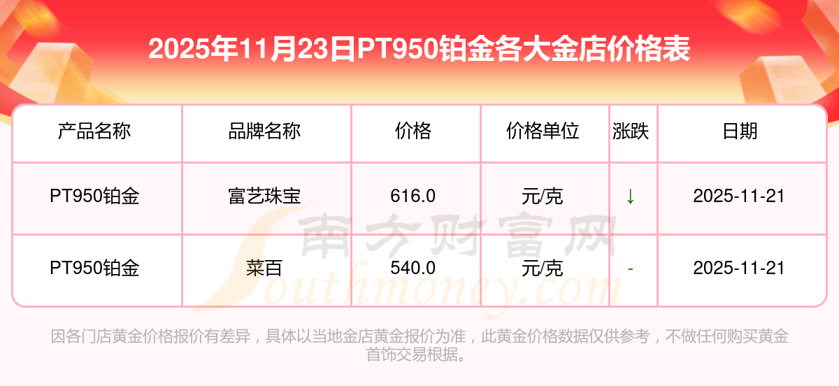 2025年11月23日周大福、周大福、周大福、周大福、周大福、周大福、周大福、老凤祥、老凤祥、老凤祥、周六福等各大金店品牌PT950铂金最新价格如下:周大福黄金价格1305.0元/克,周大福铂金价格616.0元/克,周大福饰品金价(内地)1305.0元/克,周大福黄金饰品(香港)45110.0,周大福铂金价格(香港)17570.0,周大福金条价格(香港)40690.0,周大福金条金价(内地)1143.0元/克,老凤祥黄金价格1298.0元/克,老凤祥铂金价格600.0元/克,老凤祥足金价格1298.0元/克,周六福黄金价格1266.0元/克。