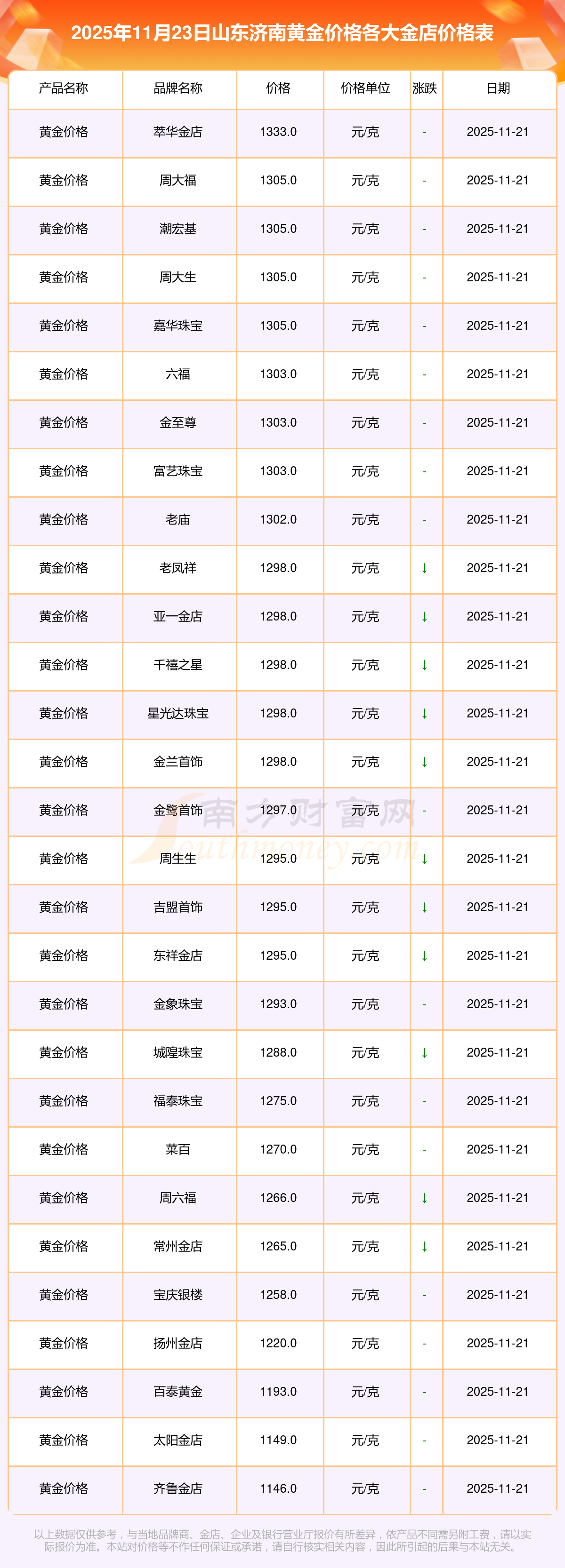 2025年11月23日山东济南各大金店黄金价格最新价格:周大福1305.0元/克,周大福616.0元/克,周大福1305.0元/克,周大福45110.0,周大福17570.0,周大福40690.0,周大福1143.0元/克,老凤祥1298.0元/克,老凤祥600.0元/克,老凤祥1298.0元/克,周六福1266.0元/克。