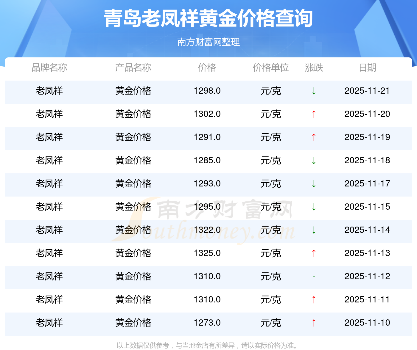 2025年11月23日,今日青岛老凤祥黄金价格:1298.0元/克。