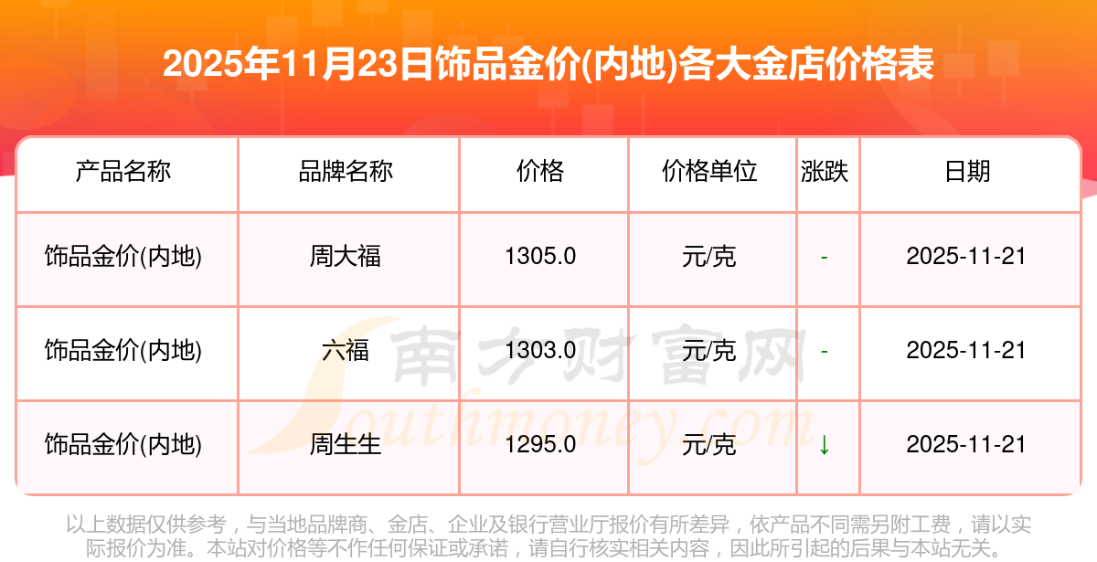 2025年11月23日各大金店饰品金价(内地)最新价格:周大福1305.0元/克,周大福616.0元/克,周大福1305.0元/克,周大福45110.0,周大福17570.0,周大福40690.0,周大福1143.0元/克,老凤祥1298.0元/克,老凤祥600.0元/克,老凤祥1298.0元/克,周六福1266.0元/克。