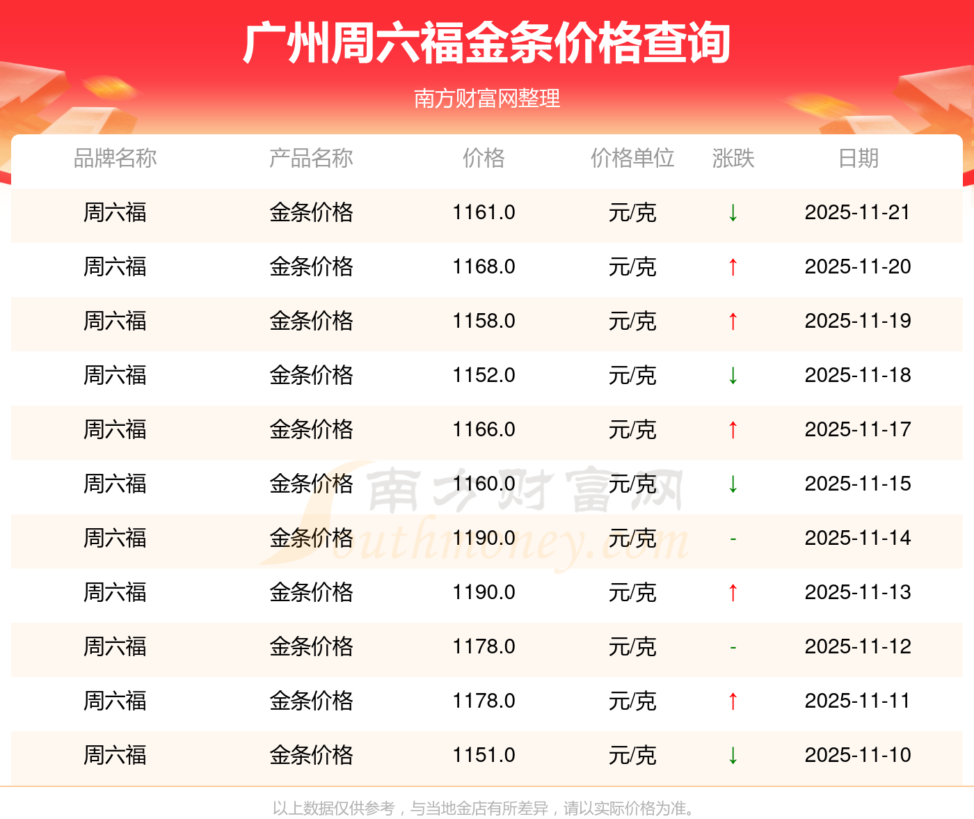 以上数据仅供参考,与当地金店有所差异,请以实际价格为准。