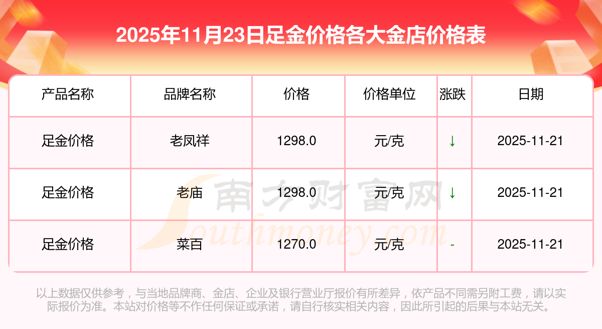 2025年11月23日各大金店足金价格最新价格:周大福1305.0元/克,周大福616.0元/克,周大福1305.0元/克,周大福45110.0,周大福17570.0,周大福40690.0,周大福1143.0元/克,老凤祥1298.0元/克,老凤祥600.0元/克,老凤祥1298.0元/克,周六福1266.0元/克。