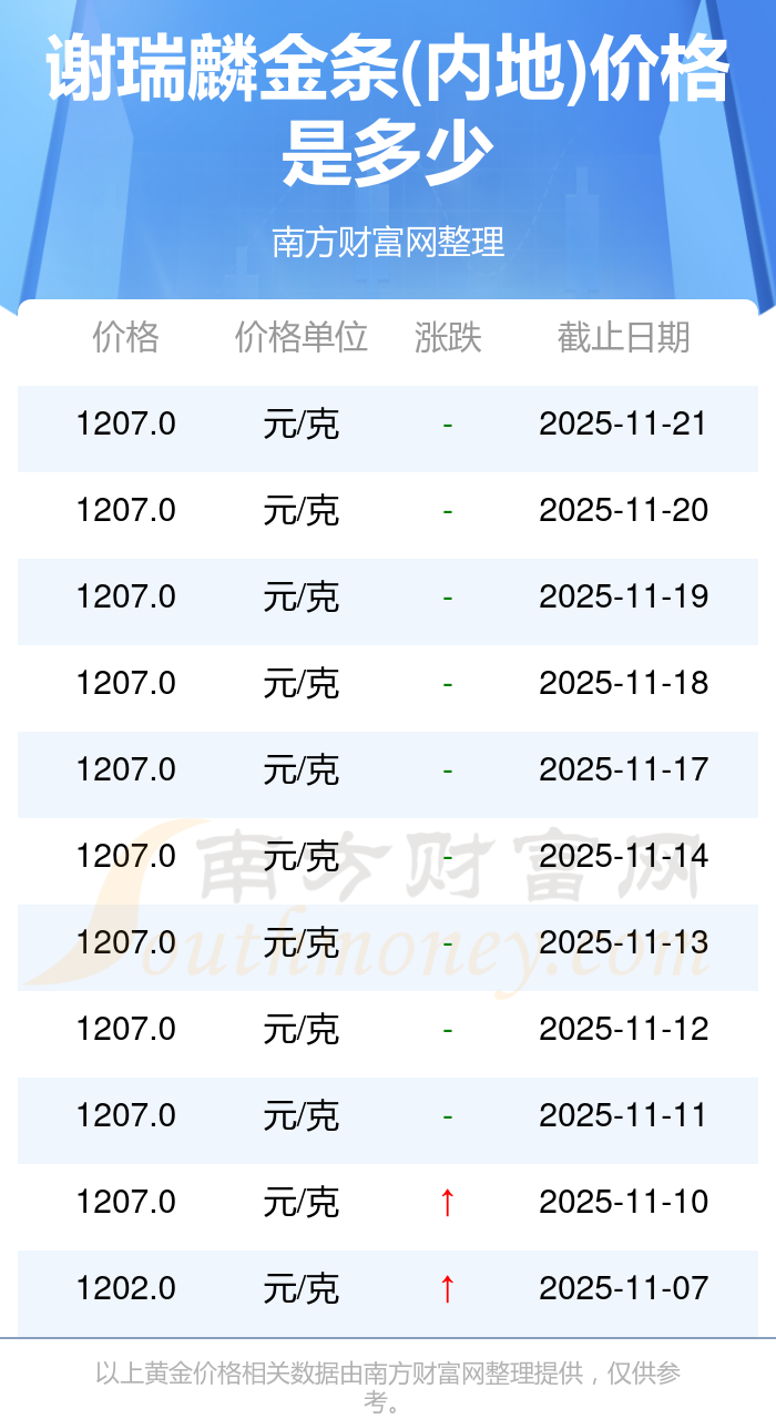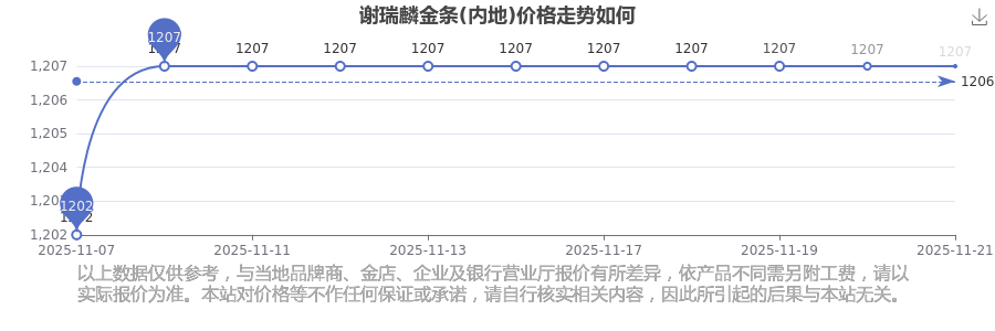 今日(2025年11月23日),谢瑞麟金条价格(内地)最新价格是1207.0元/克。
