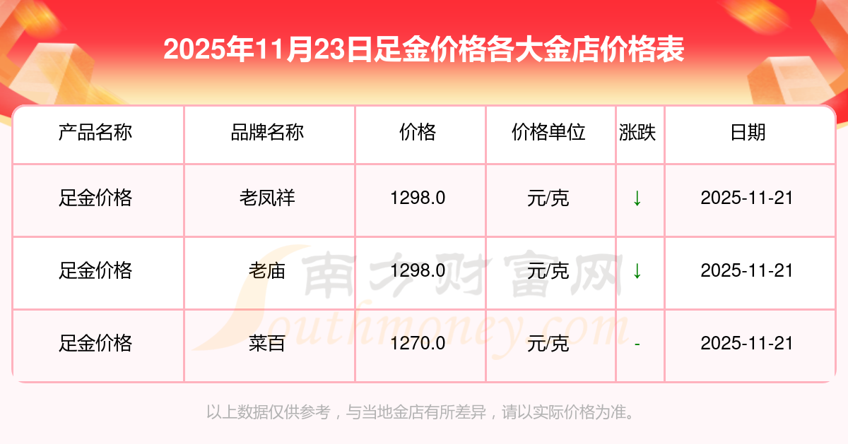 2025年11月23日各大金店足金价格最新价格:周大福1305.0元/克,周大福616.0元/克,周大福1305.0元/克,周大福45110.0,周大福17570.0,周大福40690.0,周大福1143.0元/克,老凤祥1298.0元/克,老凤祥600.0元/克,老凤祥1298.0元/克,周六福1266.0元/克。