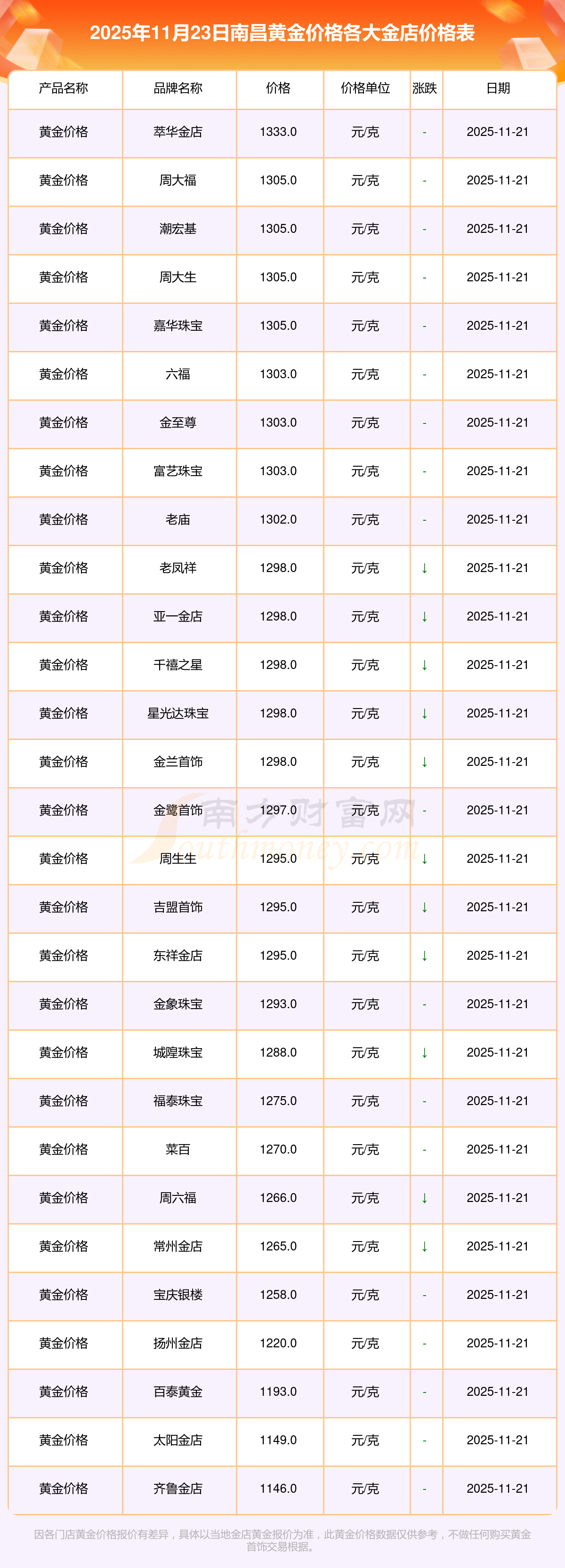 2025年11月23日南昌周大福、周大福、周大福、周大福、周大福、周大福、周大福、老凤祥、老凤祥、老凤祥、周六福等各大金店品牌黄金价格最新价格如下:周大福黄金价格1305.0元/克,周大福铂金价格616.0元/克,周大福饰品金价(内地)1305.0元/克,周大福黄金饰品(香港)45110.0,周大福铂金价格(香港)17570.0,周大福金条价格(香港)40690.0,周大福金条金价(内地)1143.0元/克,老凤祥黄金价格1298.0元/克,老凤祥铂金价格600.0元/克,老凤祥足金价格1298.0元/克,周六福黄金价格1266.0元/克。