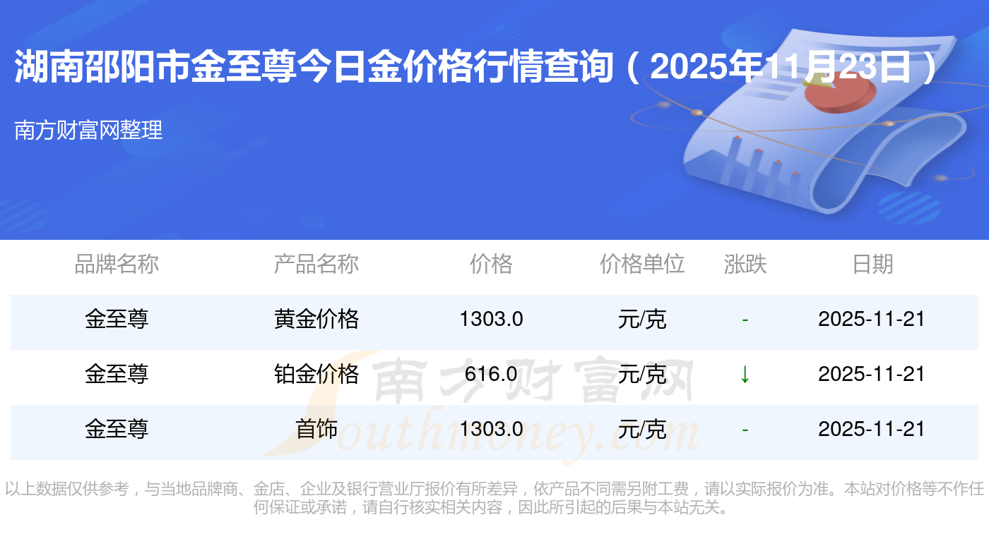 湖南邵阳市金至尊,现在一克黄金定价多少?黄金价格1305.0元/克,铂金价格616.0元/克,饰品金价(内地)1305.0元/克,黄金饰品(香港)45110.0,铂金价格(香港)17570.0,金条价格(香港)40690.0,金条金价(内地)1143.0元/克,黄金价格1298.0元/克,铂金价格600.0元/克,足金价格1298.0元/克,黄金价格1266.0元/克。