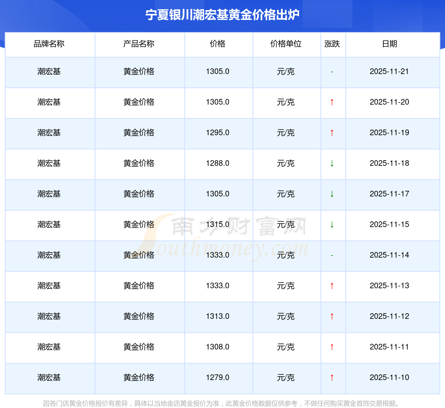 今日宁夏银川潮宏基黄金价格最新为:1305.0元/克。