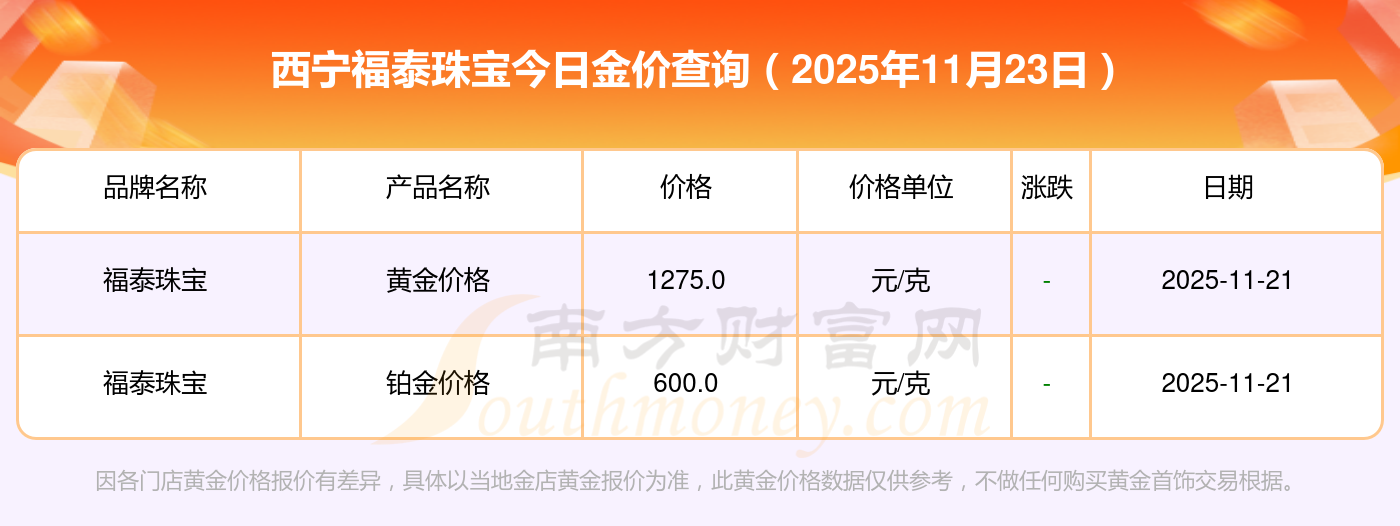 2025年11月23日西宁福泰珠宝黄金的单价,一克为多少?黄金价格1305.0元/克,铂金价格616.0元/克,饰品金价(内地)1305.0元/克,黄金饰品(香港)45110.0,铂金价格(香港)17570.0,金条价格(香港)40690.0,金条金价(内地)1143.0元/克,黄金价格1298.0元/克,铂金价格600.0元/克,足金价格1298.0元/克,黄金价格1266.0元/克。