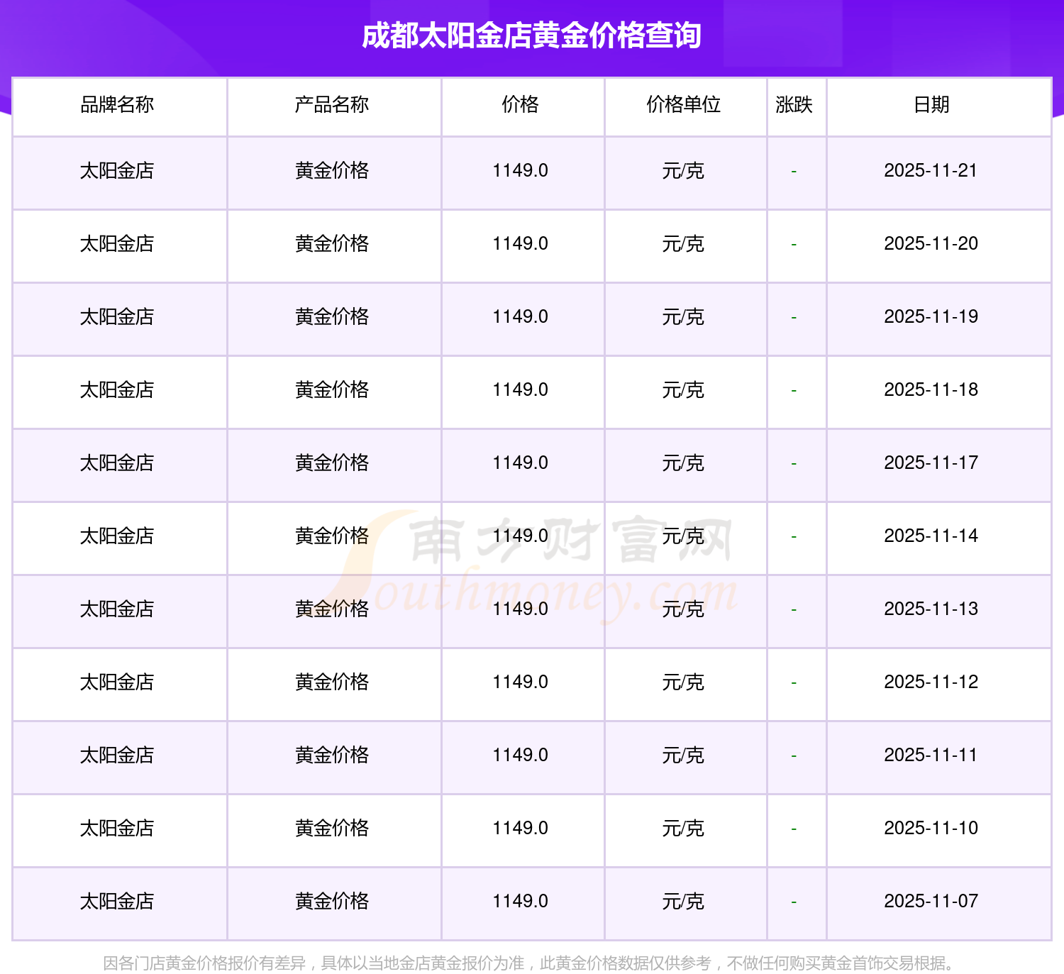 今日成都太阳金店黄金价格公布今日每克黄金的价值是多少2025年11月23日,成都太阳金店黄金价格每克的售卖价位为1149.0元/克。