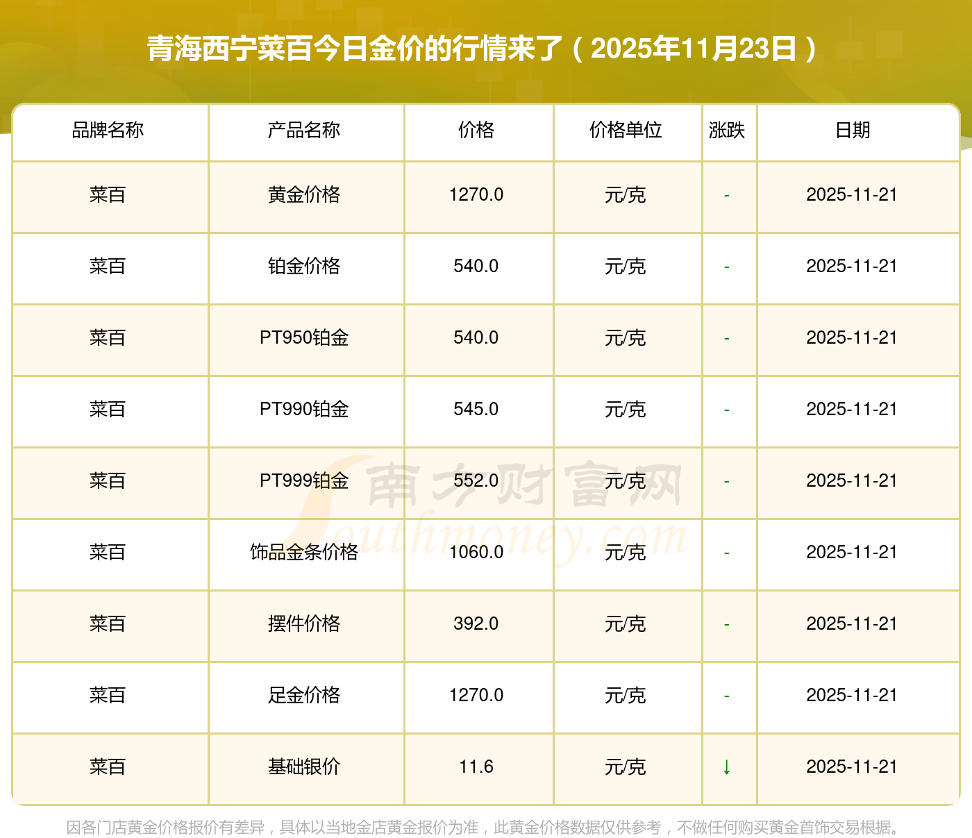 今日黄金价格查询_现在金价黄金一克多少钱,黄金价格是多少钱一克?2025年11月23日青海西宁菜百黄金一克的市场行情价是多少?黄金价格1305.0元/克,铂金价格616.0元/克,饰品金价(内地)1305.0元/克,黄金饰品(香港)45110.0,铂金价格(香港)17570.0,金条价格(香港)40690.0,金条金价(内地)1143.0元/克,黄金价格1298.0元/克,铂金价格600.0元/克,足金价格1298.0元/克,黄金价格1266.0元/克。