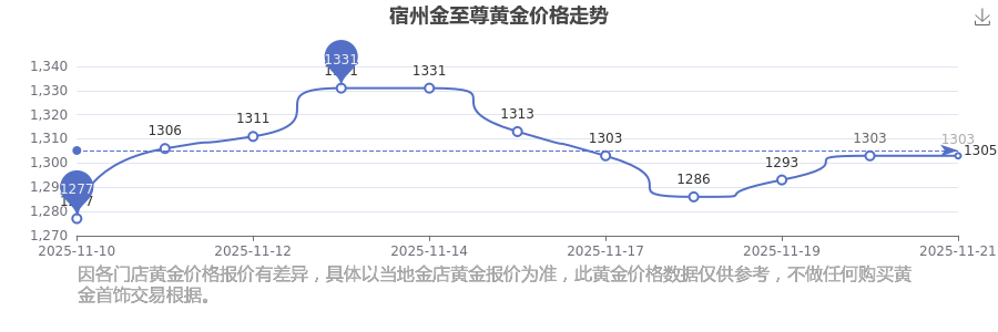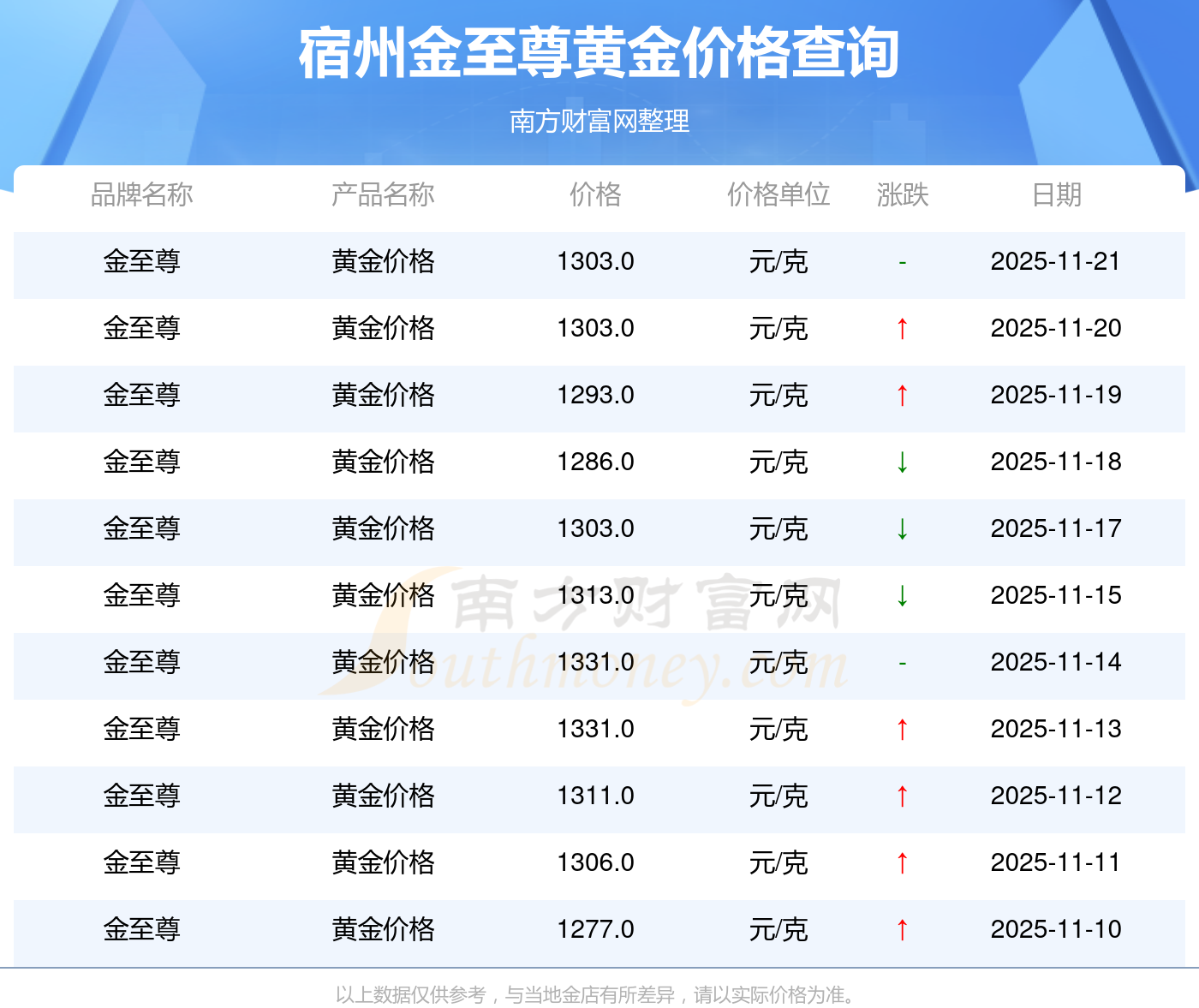 宿州金至尊现在黄金价格多少钱1克,请问今天一克黄金值多少钱?今日宿州金至尊黄金价格查询,宿州金至尊黄金价格在 2025年11月23日为 1303.0元/克。