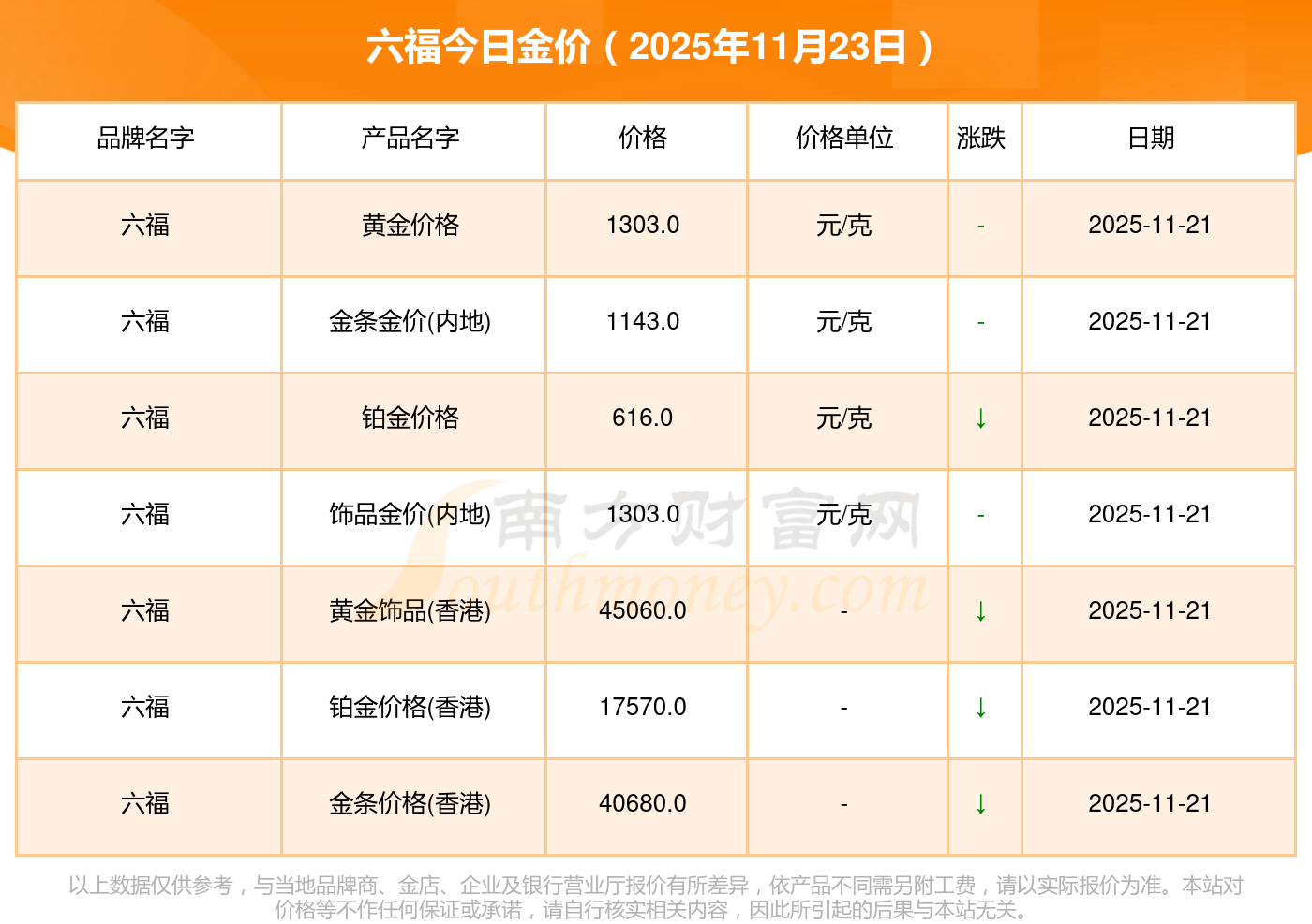 2025年11月23日各大金店黄金价格最新价格:周大福1305.0元/克,周大福616.0元/克,周大福1305.0元/克,周大福45110.0,周大福17570.0,周大福40690.0,周大福1143.0元/克,老凤祥1298.0元/克,老凤祥600.0元/克,老凤祥1298.0元/克,周六福1266.0元/克。