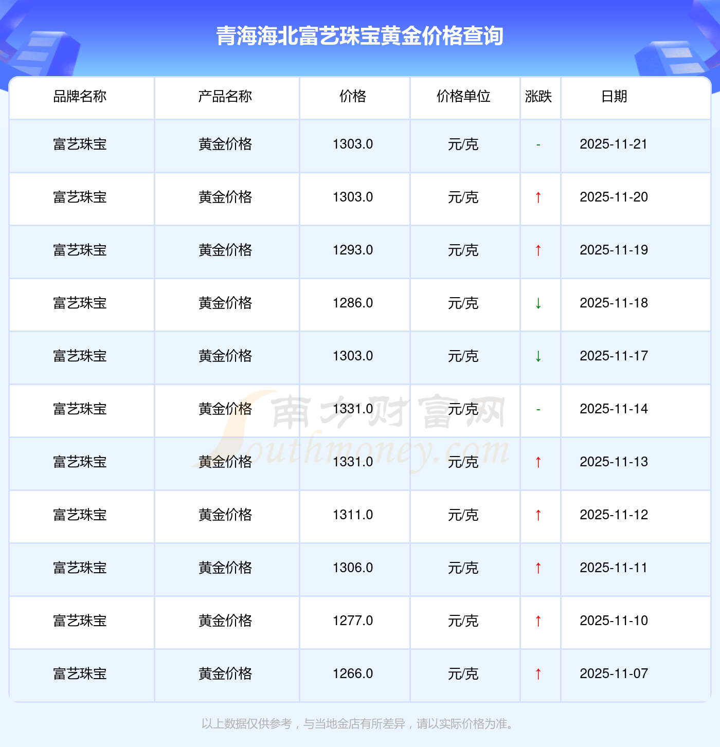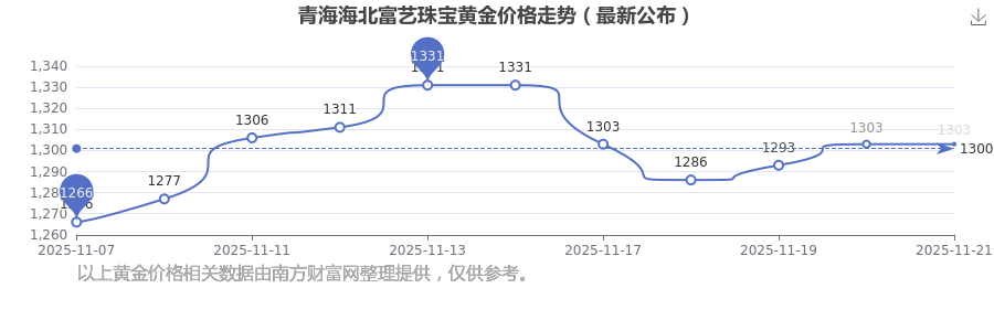 今日青海海北富艺珠宝黄金价格:1303.0元/克。