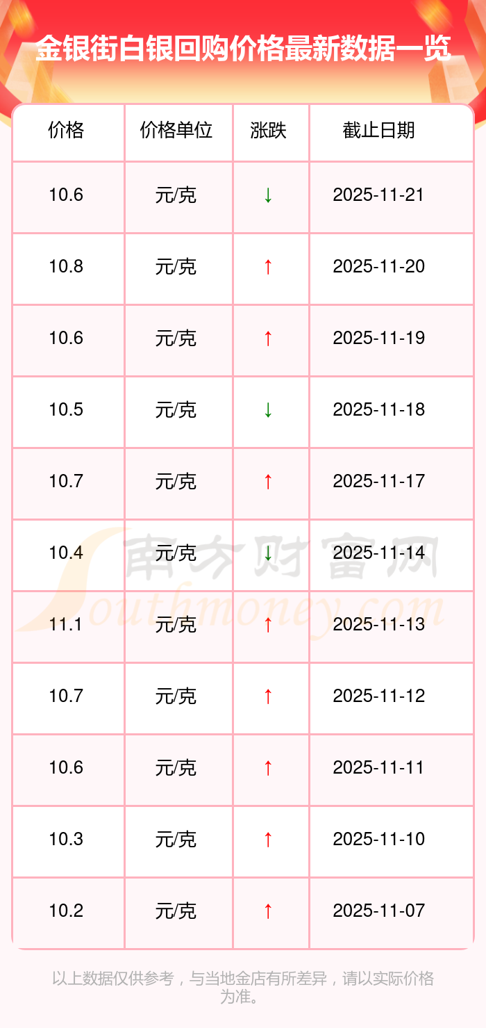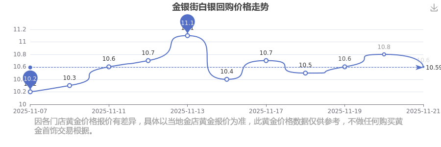 今日金银街所公布的 白银回购最新价格为10.6元/克。