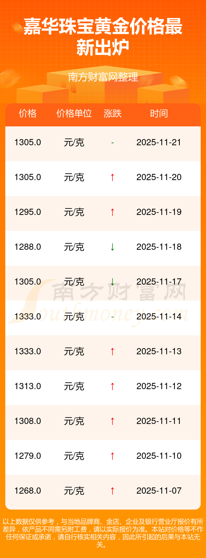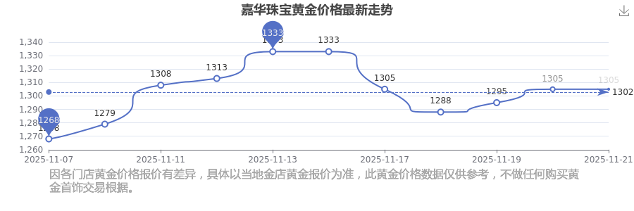 2025年11月23日嘉华珠宝黄金价格为1305.0元/克。