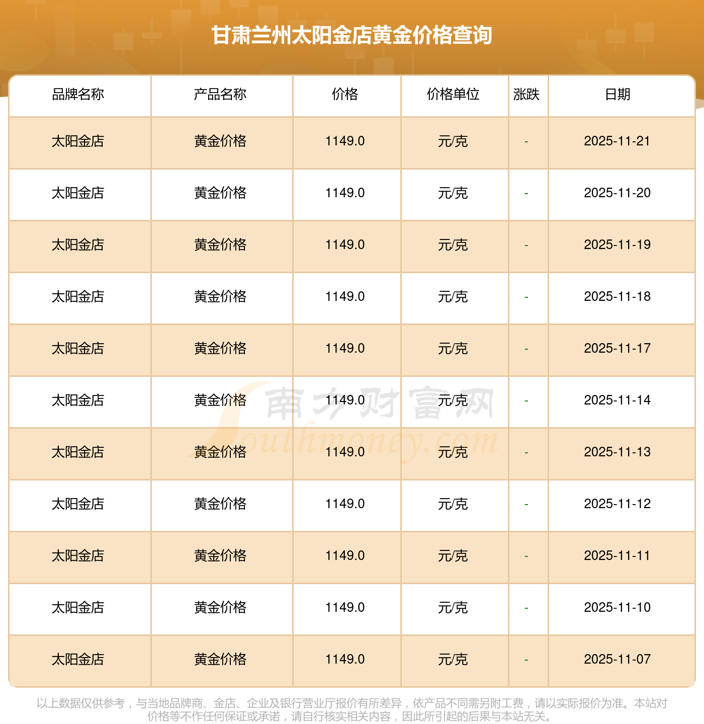 1149.0元/克,这是甘肃兰州太阳金店于 2025年11月23日所定的黄金价格。