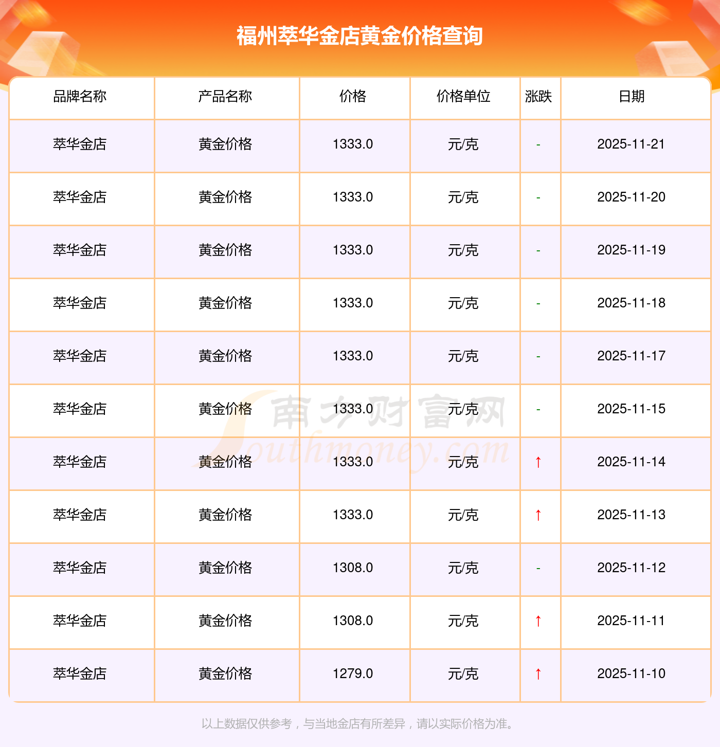 今日福州萃华金店黄金价格公布黄金每克价值多少钱今日(2025年11月23日),福州萃华金店黄金价格的定价为 1333.0元/克。