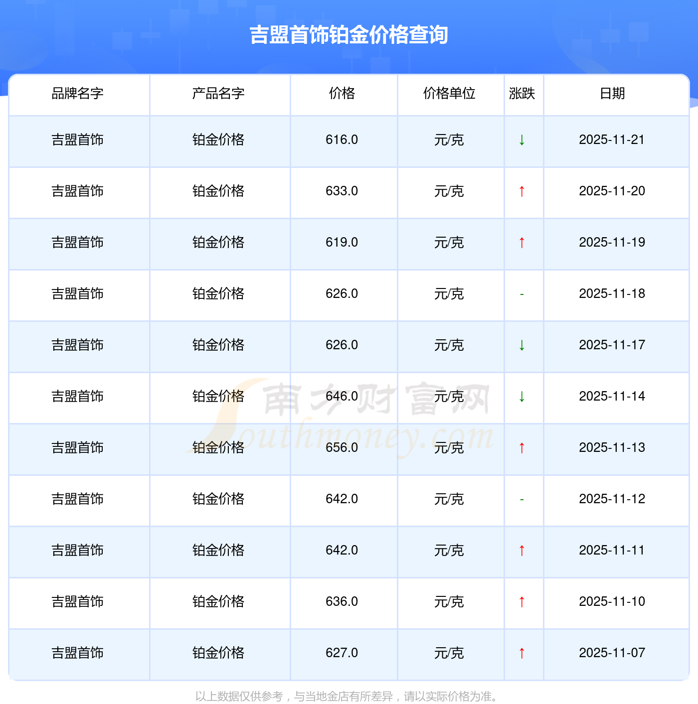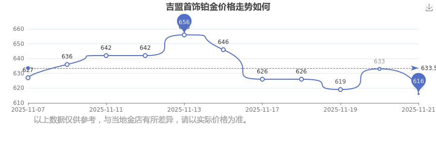 今日(2025年11月23日),吉盟首饰铂金价格最新价格是616.0元/克。