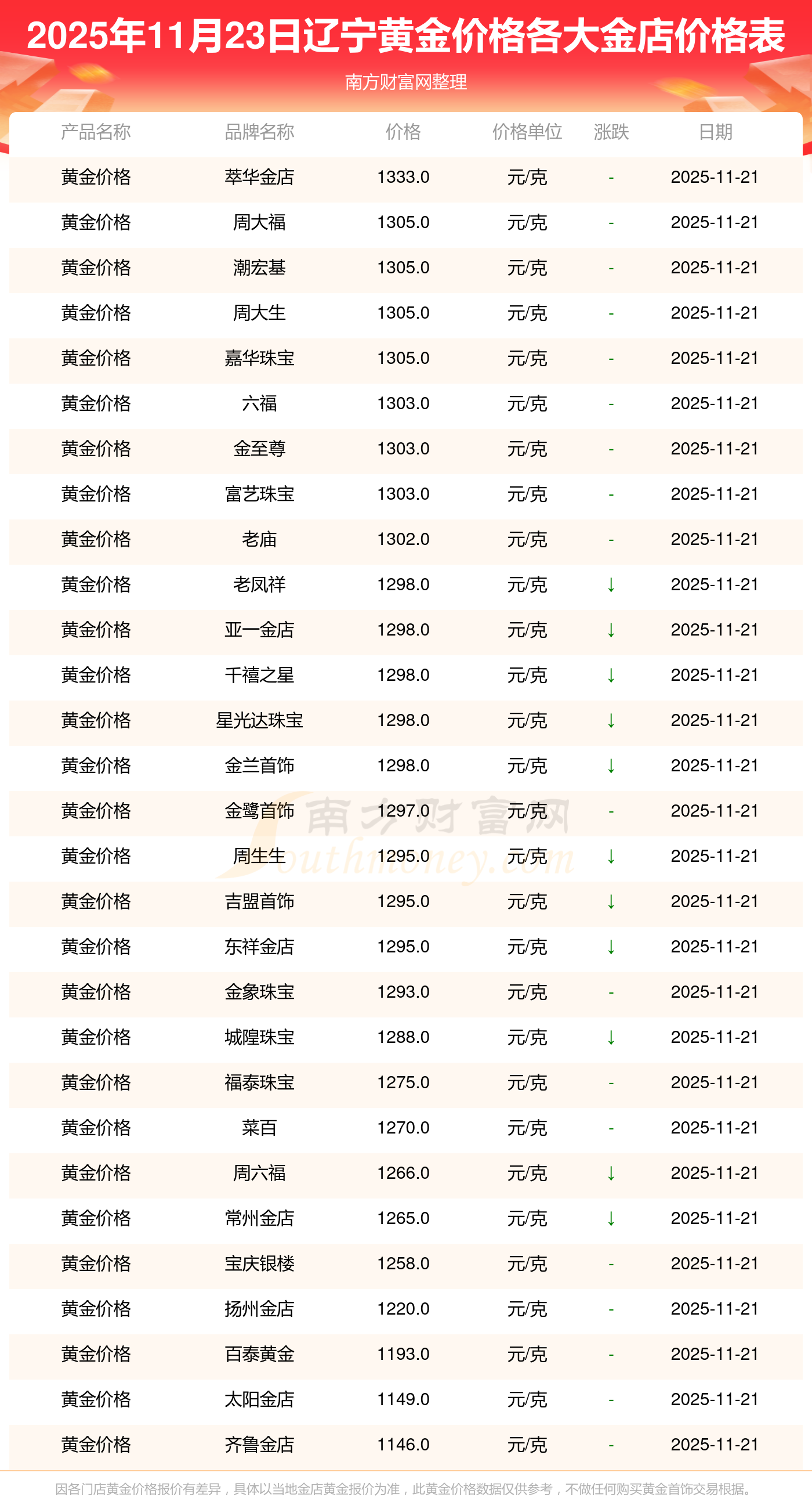 2025年11月23日辽宁各大金店黄金价格最新价格:周大福1305.0元/克,周大福616.0元/克,周大福1305.0元/克,周大福45110.0,周大福17570.0,周大福40690.0,周大福1143.0元/克,老凤祥1298.0元/克,老凤祥600.0元/克,老凤祥1298.0元/克,周六福1266.0元/克。
