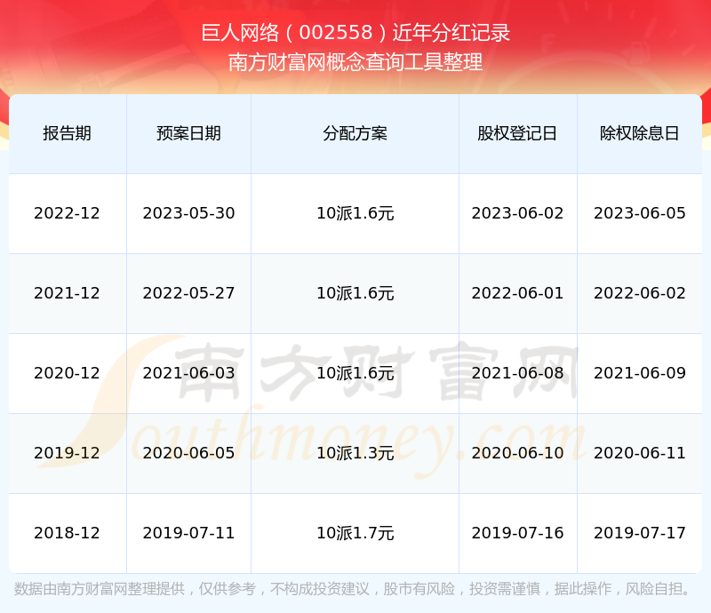 巨人网络最新一次公布的分红方案为10派1.6元。本次权益分派股权登记日为2023年6月2日,除权除息日为2023年6月5日,派息日为2023年6月5日。