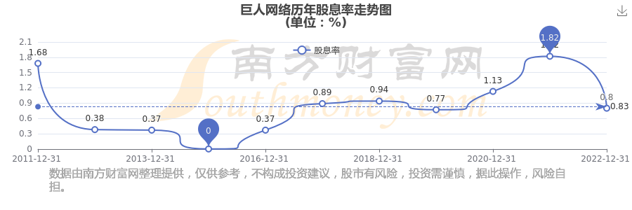 近年巨人网络年度股息率走势如下图: