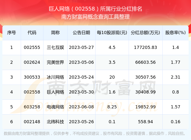 二、巨人网络002558行业分红排名