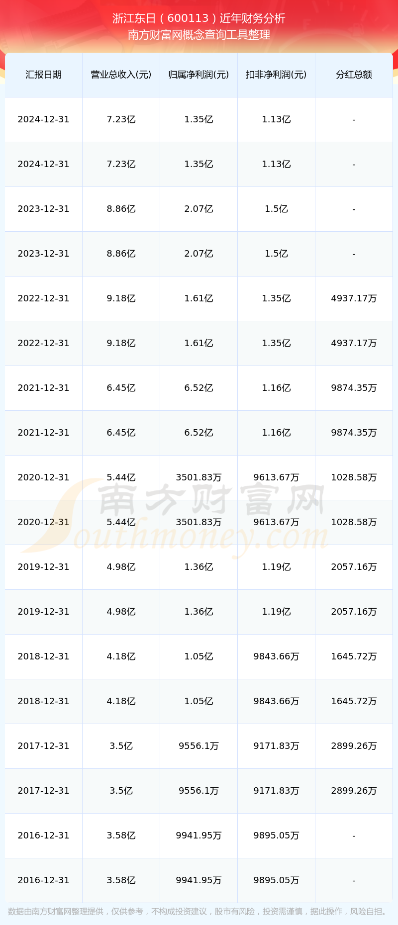 浙江东日2024年总营收7.23亿,同比增长-18.44%;净利润1.35亿,同比增长-34.94%;销售毛利率38.76%。