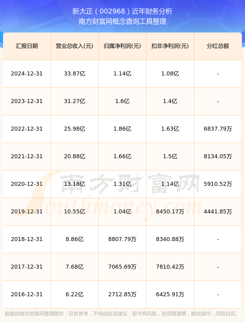 新大正2024年总营收33.87亿,同比增长8.32%;净利润1.14亿,同比增长-28.95%;销售毛利率11.69%。