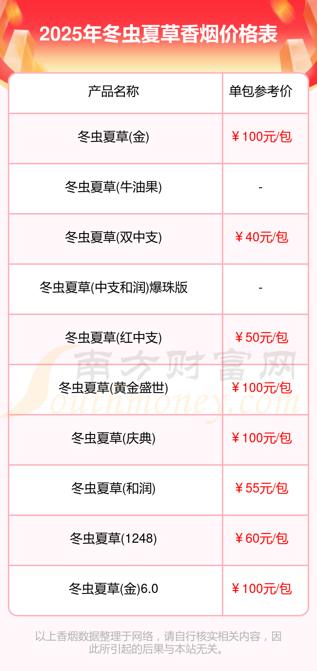 2025年冬虫夏草价格最高的香烟是冬虫夏草(金),参考价100.0元/包,最低的是冬虫夏草(双中支),参考价40.0元/包,价格高低差为60元/包。