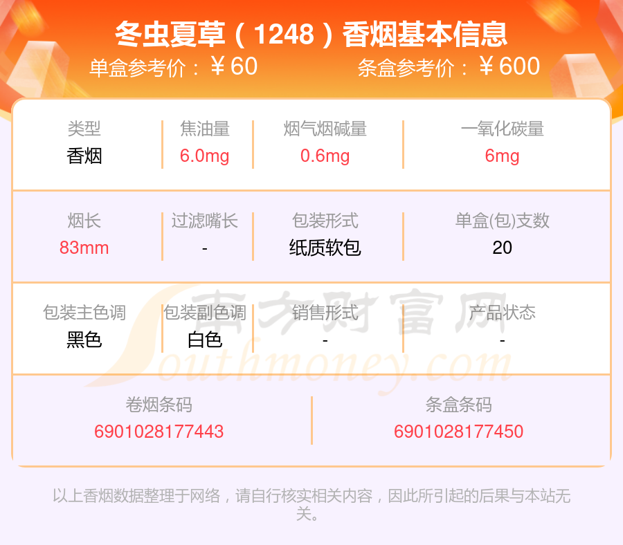 择烟网为大家盘点了60-70元的冬虫夏草香烟,分别有冬虫夏草(1248)参考价60.0元/包、冬虫夏草(天润)参考价60元/包等。
