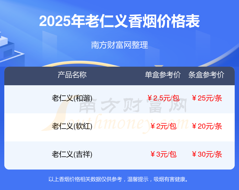 老仁义(吉祥)参考价3.0元/包、老仁义(和谐)参考价2.5元/包、老仁义(软红)参考价2.0元/包。