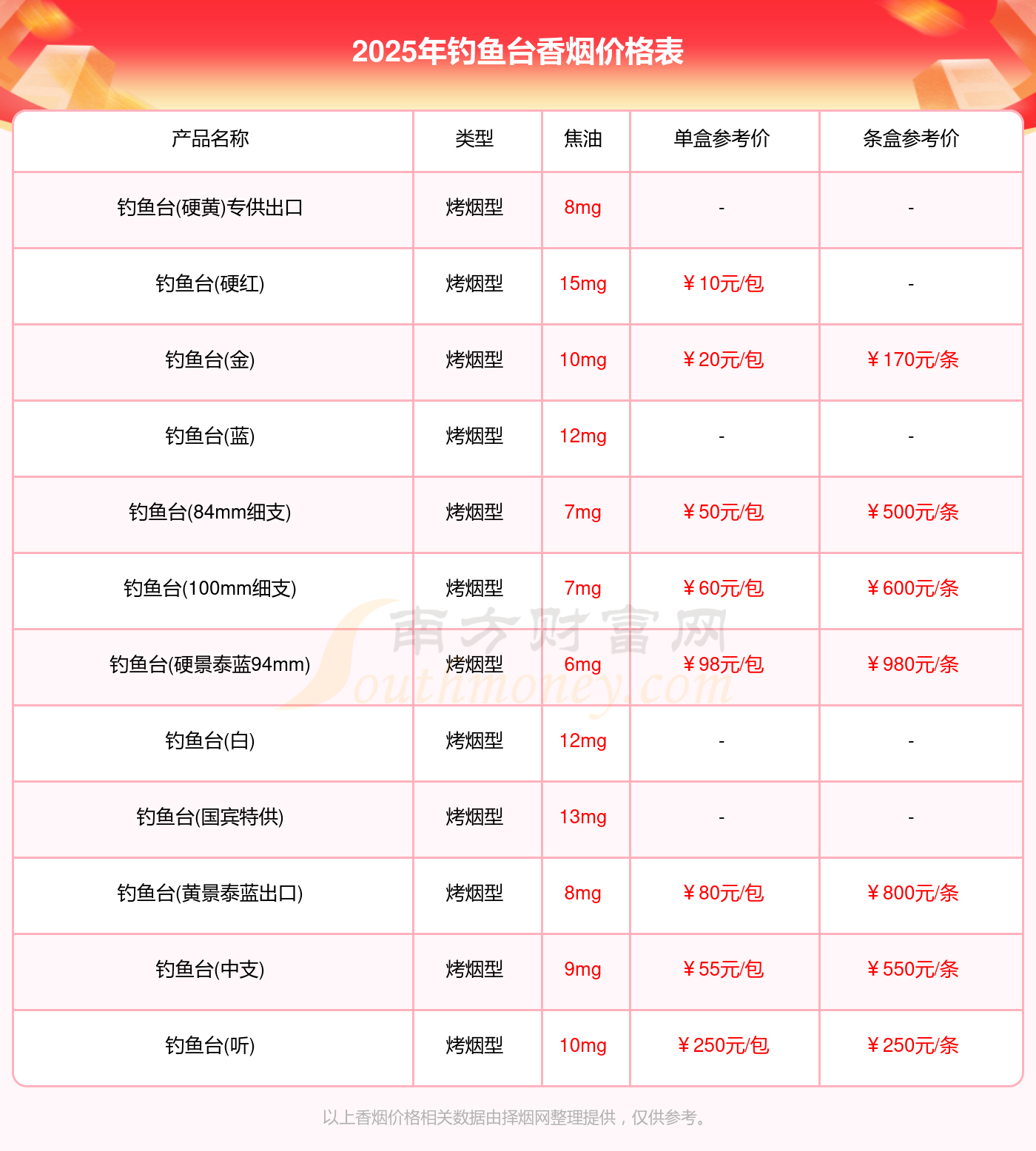 2025年钓鱼台香烟钓鱼台(听)、钓鱼台(硬景泰蓝94mm)、钓鱼台(黄景泰蓝出口)等最新价格如下: