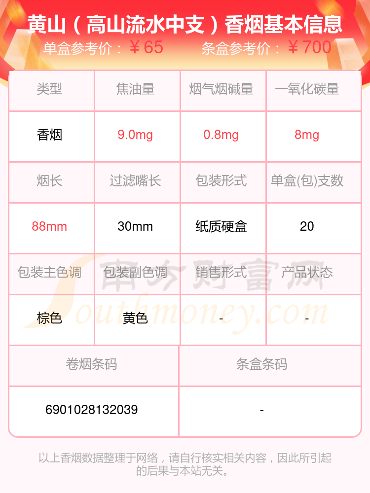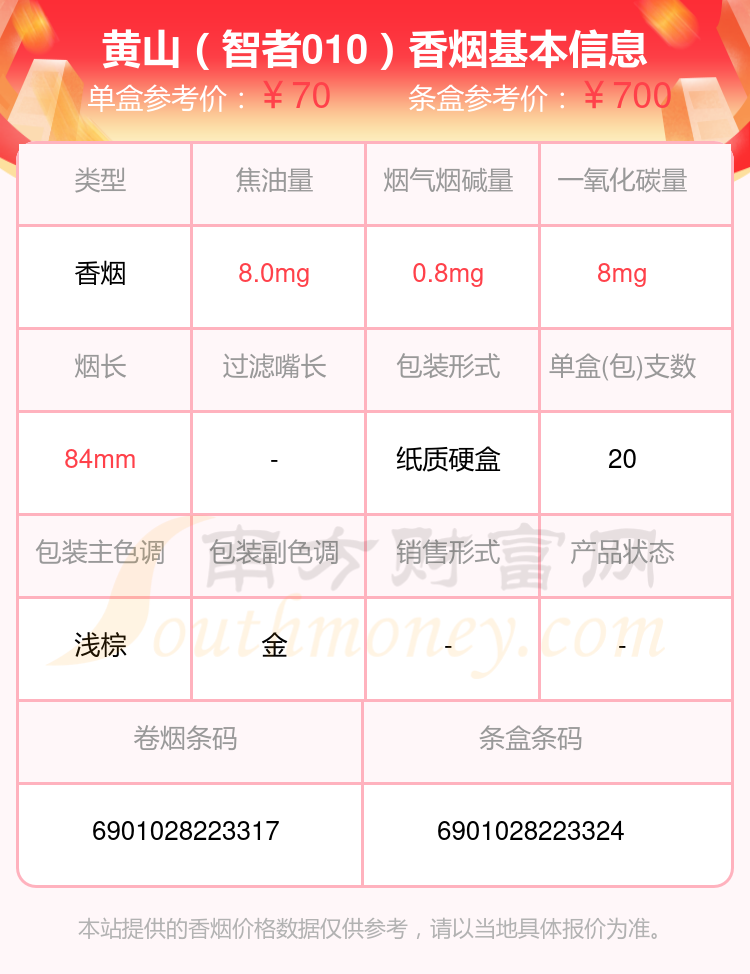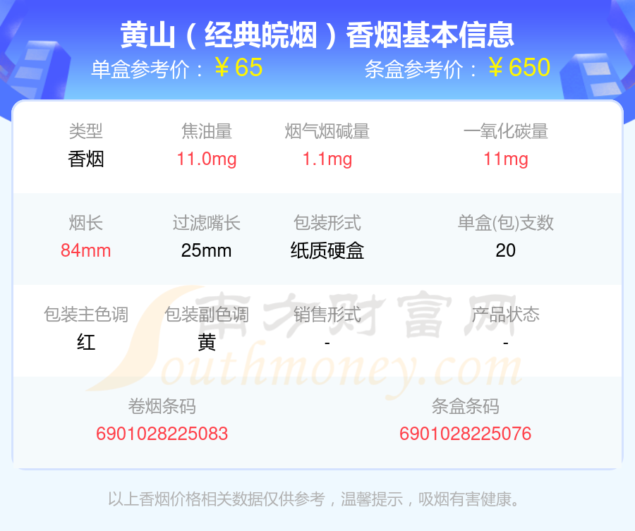 黄山香烟六十元到八十元左右的烟有黄山(智者010)、黄山(高山流水中支)、黄山(经典皖烟)等,详细价格如下: