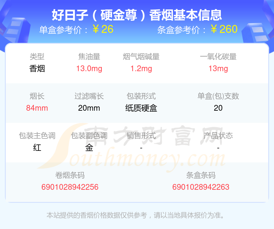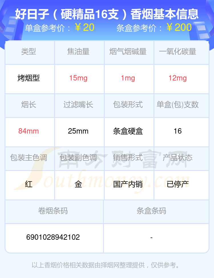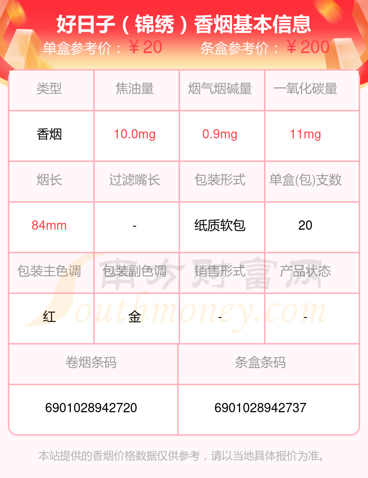 好日子香烟20元-40元的烟有哪些?择烟网为大家整理提供,分别有:好日子(硬金尊)、好日子(锦绣)、好日子(硬精品16支)等,具体价格如下: