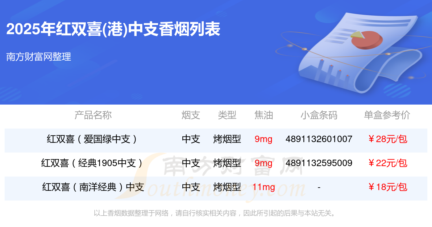 红双喜(港)香烟中支的烟分别有红双喜(爱国绿中支)参考价28.0元/包、红双喜(经典1905中支)参考价22.0元/包、红双喜(南洋经典)中支参考价18.0元/包等。