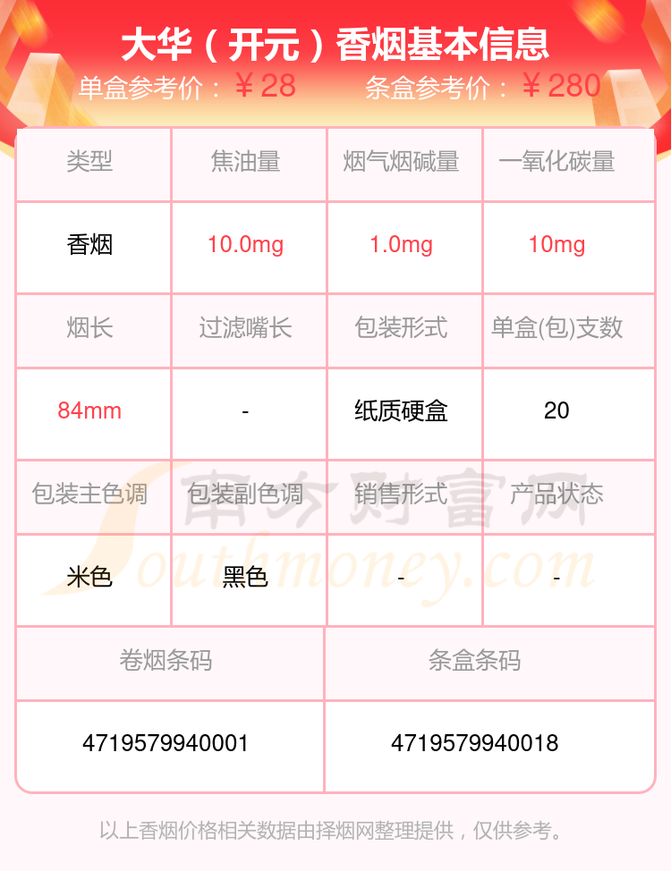 20至30元左右的大华香烟有哪些?择烟网为大家整理盘点,有大华(开元硬包烟)、大华(大时代)、大华(开元)、大华(黄金眼)、大华(功夫)等,详细价格如下: