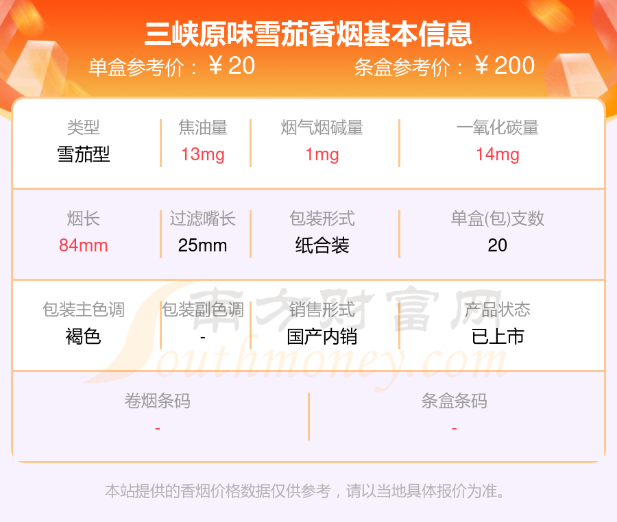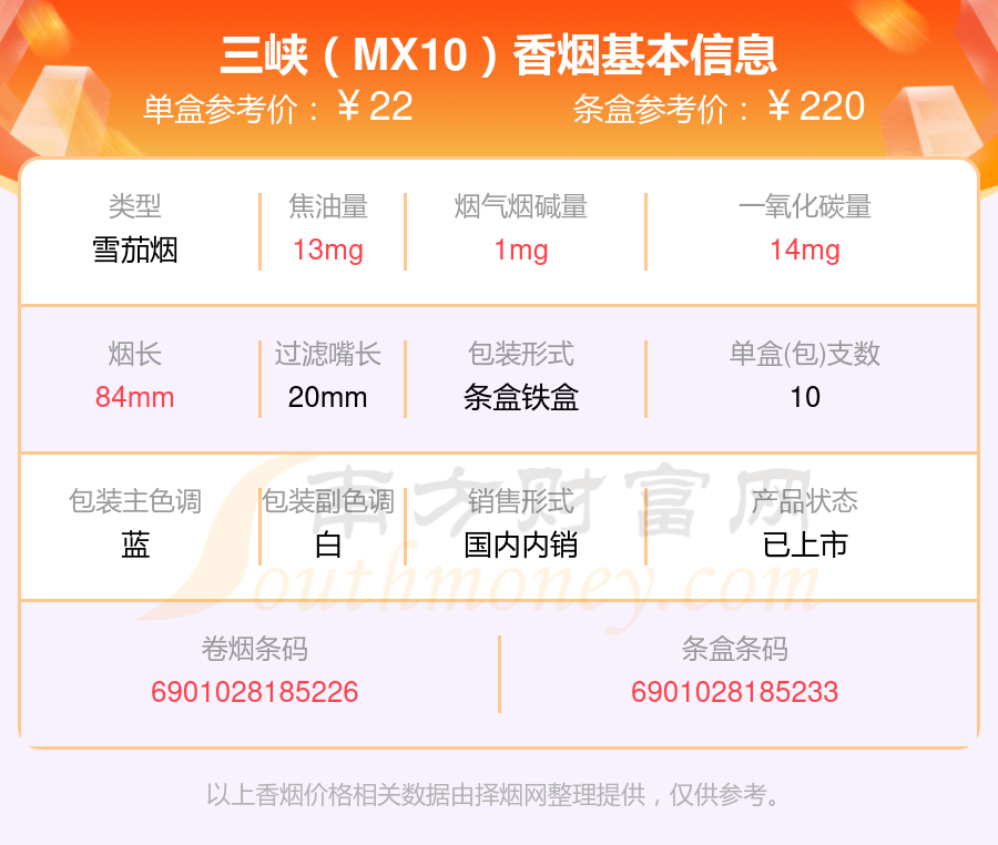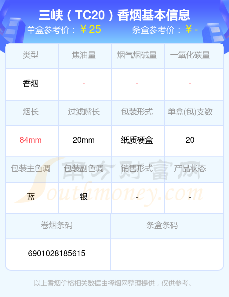 三峡(TC20)参考价25.0元/包、三峡(MX10)参考价22元/包、三峡原味雪茄参考价20元/包、三峡(WX20)参考价10元/包等。