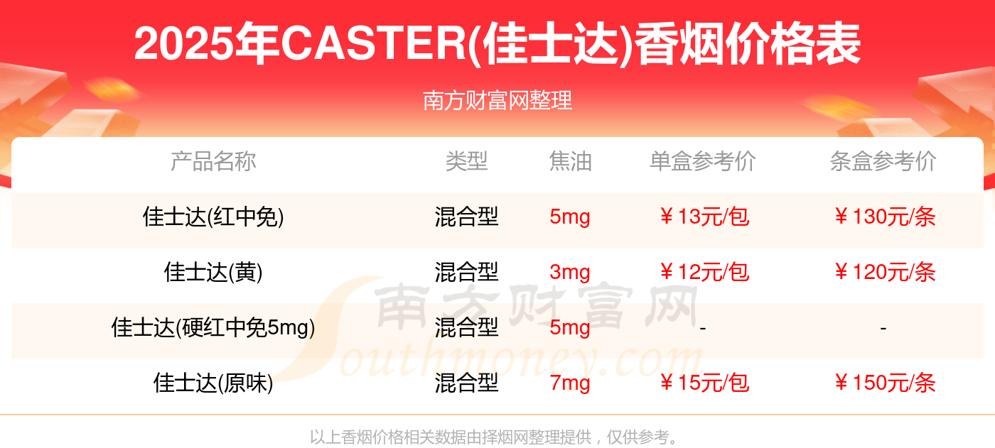 CASTER(佳士达)香烟最新价格2025:佳士达(原味)参考价150.0元/条、佳士达(红中免)参考价130.0元/条、佳士达(黄)参考价120.0元/条。