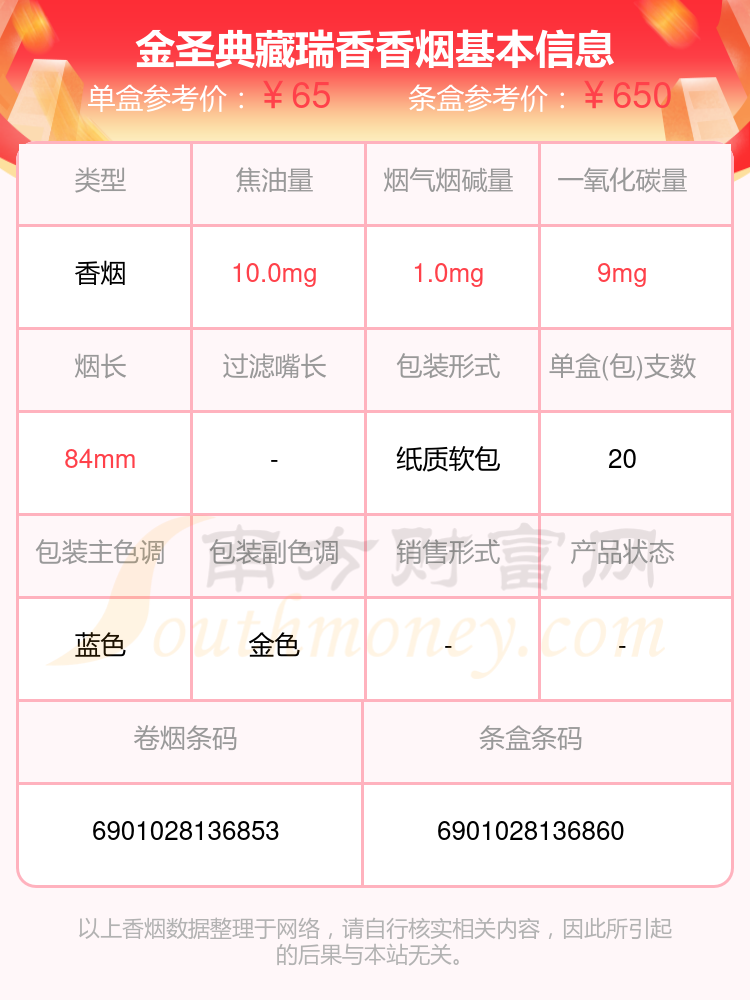 金圣典藏瑞香香烟网友评分:口味评分7.2分,外观评分7.5分,性价比评分6.1分,综合得分6.9分。