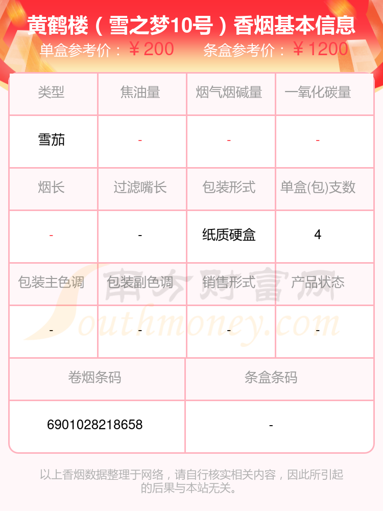 黄鹤楼(雪之梦10号)条盒参考价:1200元