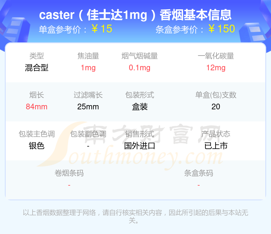 择烟网为大家盘点了CASTER(佳士达)香烟烟碱量低于10mg的,分别有佳士达(原味)、日免caster(7mg)、佳士达(红)、佳士达(红中免)、佳士达(硬红)、佳士达(黄)、caster(佳士达1mg)等,详细价格如下: