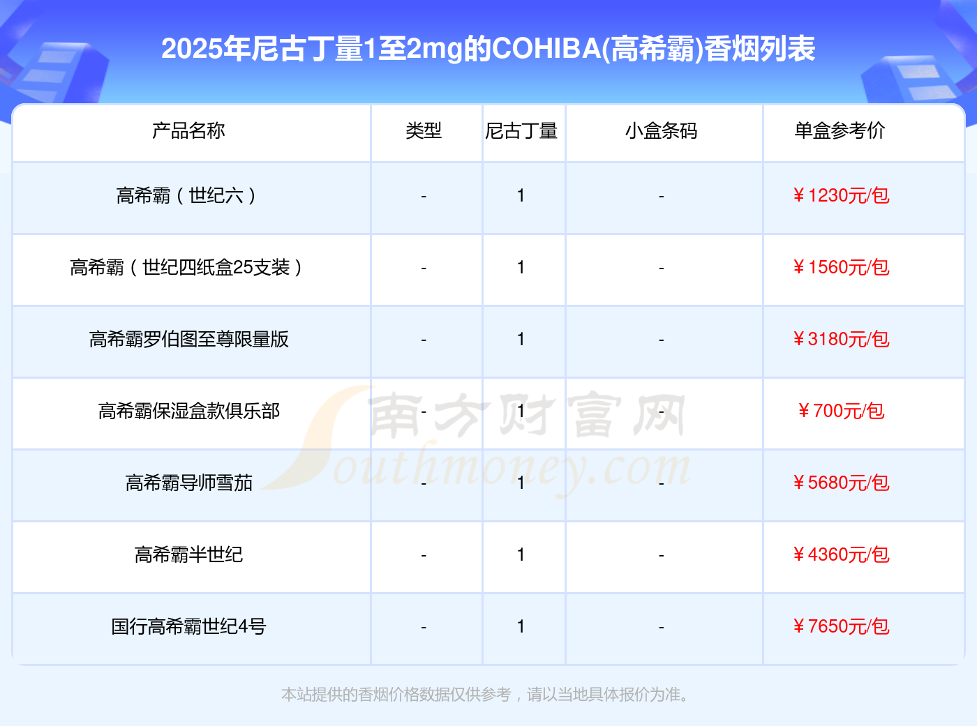 择烟网为大家盘点了COHIBA(高希霸)香烟尼古丁量1至2mg的烟,有以下这些: