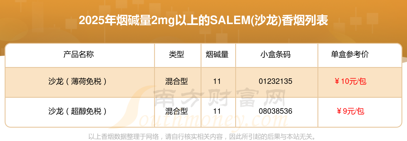 2025年烟碱量2mg以上的SALEM(沙龙)香烟一览表